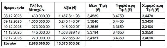 H ΑΛΦΑ ΤΡΑΠΕΖΑ (η ‘Τράπεζα’), σε συνέχεια της από 17.09.2025 ανακοίνωσής της, ενημερώνει ότι, στο Πλαίσιο του Προγράμματος Αγοράς Ιδίων Μετοχών που εγκρίθηκε με την απόφαση της Έκτακτης Γενικής Συνέλευσης των Μετόχων της με ημερομηνία 12.6.2025, κατά το διάστημα 08.12.2025 – 12.12.2025, προέβη σε αγορά μέσω του Χρηματιστηρίου Αθηνών συνολικά 2.968.000 ίδιων μετοχών, με μέση τιμή κτήσης 3,3948 € ανά μετοχή και συνολικό κόστος 10.075.638,02 €.
