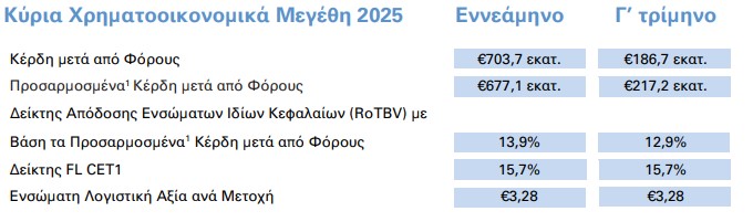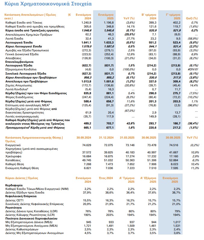 Για το εννεάμηνο του 2025, τα καθαρά κέρδη μετά από φόρους ανήλθαν σε €704 εκατ., με θεμέλιο την ισχυρή κεφαλαιακή μας θέση, με τον δείκτη CET1 να διαμορφώνεται στο 15,7%, γεγονός που μας επιτρέπει να υλοποιούμε με συνέπεια τους στόχους μας για οργανική ανάπτυξη και παράλληλα, εφαρμόζοντας ένα σαφές πλαίσιο κεφαλαιακής διαχείρισης, να εστιάζουμε σε επιλεκτικές εξαγορές και στην μεγέθυνση των αποδόσεων προς τους Μετόχους μας. Ήδη έχουν σχηματιστεί προβλέψεις ύψους €352 εκατ. για διανομές, ενώ τον Δεκέμβριο θα καταβληθεί ενδιάμεσο μέρισμα ύψους €111 εκατ.