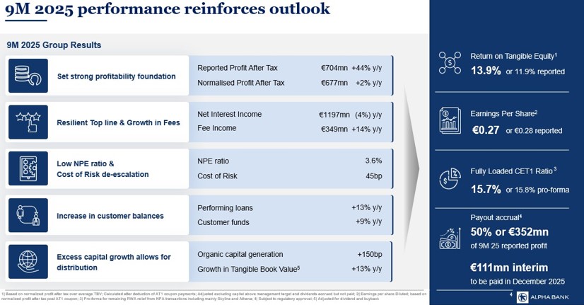 Η Alpha Bank στο 9μηνο κατέγραψε καθαρά κέρδη €704 εκατ. (+44%), επιτυγχάνοντας το 75% του ετήσιου στόχου, με θετική δυναμική στα έσοδα από τόκους για δεύτερο συνεχές τρίμηνο και ισχυρή κεφαλαιακή επάρκεια (FL CET1 15,7%). Η Τράπεζα έχει σχηματίσει στο 9μηνο πρόβλεψη ύψους €352 εκατ. για διανομή μερίσματος στους μετόχους, ενώ αναμένεται να καταβάλει προμέρισμα €111 εκατ. εντός του Δεκεμβρίου.