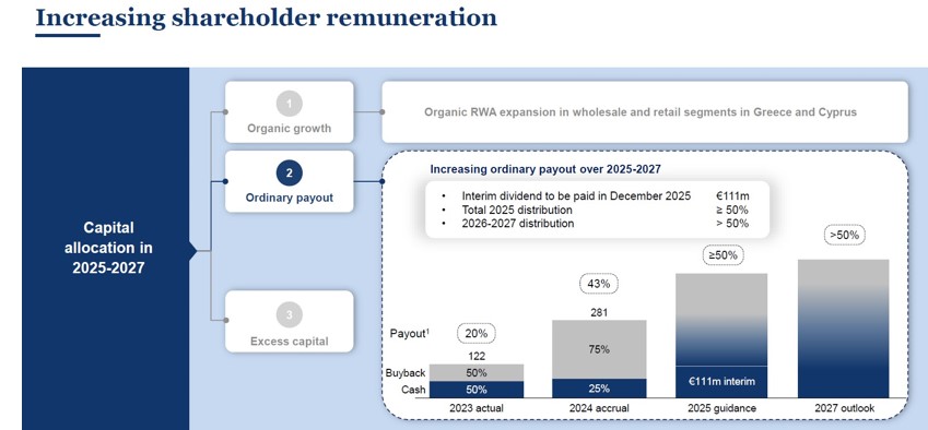 Η συνεχιζόμενη ενίσχυση της κεφαλαιακής βάσης και η ισχυρή οργανική δημιουργία κεφαλαίου επιτρέπουν στην Τράπεζα να εξετάζει προοδευτικά υψηλότερα ποσοστά διανομής, με στόχο την προβλέψιμη και αυξανόμενη απόδοση για τους μετόχους.