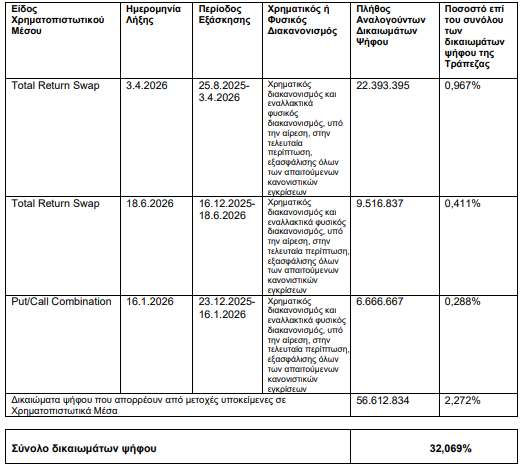 Όσον αφορά τη συμμετοχή της UniCredit σε χρηματοοικονομικά προϊόντα, με προεπιλεγμένη μέθοδο το χρηματικό διακανονισμό και εναλλακτικά το φυσικό διακανονισμό, υπό την αίρεση, στην τελευταία περίπτωση, της εξασφάλισης όλων των εποπτικών εγκρίσεων, αυτή διαμορφώνεται όπως αναφέρεται αναλυτικά στον κατωτέρω πίνακα και δύναται να οδηγήσει στην απόκτηση επιπλέον 52.612.834 κοινών μετοχών με δικαίωμα ψήφου, που αντιστοιχούν στο 2,272% του συνόλου των δικαιωμάτων ψήφου της Αlpha Bank.