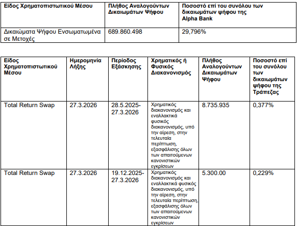 Ειδικότερα, η Alpha Bank με ανακοίνωσή της στο Χρηματιστήριο ενημέρωσε το επενδυτικό κοινό ότι, σύμφωνα με την από 9 Ιανουαρίου 2026 γνωστοποίηση της UniCredit S.p.A, η τελευταία προχώρησε στην εξάσκηση χρηματοοικονομικών προϊόντων, τα οποία οδήγησαν στην άμεση απόκτηση 689.860.498 κοινών μετοχών με δικαίωμα ψήφου, που αντιστοιχούν σε ποσοστό 29,796 % επί του συνόλου δικαιωμάτων της Αlpha Bank.