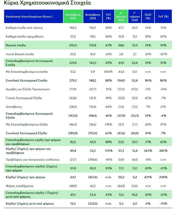 Ως αποτέλεσμα, τα καθαρά έσοδα από τόκους ενισχύθηκαν κατά 58% και διαμορφώθηκαν σε €168,3 εκατ. Τα καθαρά έσοδα από προμήθειες ανήλθαν σε €37,2 εκατ., αυξημένα κατά 96%, αντιπροσωπεύοντας το 16,5% των επαναλαμβανόμενων εσόδων, ενώ τα κεφάλαια πελατών υπό διαχείριση διαμορφώθηκαν σε €832 εκατ., αυξημένα κατά 10% από τα τέλη του 2024.