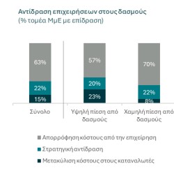 - Το 15% ακολούθησε μια στρατηγική ανάγκης, μετακυλίοντας το αυξημένο κόστος, κυρίως μεταξύ όσων αντιμετώπισαν εντονότερη πίεση (23% έναντι 8% των χαμηλής έντασης επιδράσεων).