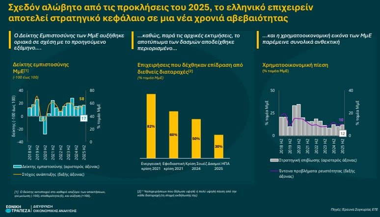 Σε ένα έτος όπου ο Δείκτης Παγκόσμιας Αβεβαιότητας ανήλθε σε ιστορικά υψηλά επίπεδα (έως και 600% πάνω από τον μακροχρόνιο μέσο όρο τον Σεπτέμβριο του 2025), η διατήρηση θετικών προσδοκιών από τις ΜμΕ είναι αναμφισβήτητα αξιοσημείωτη.