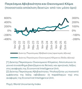 Ωστόσο, δεν αποτελεί ελληνική ιδιαιτερότητα. Αντιθέτως συνάδει με την ανοδική πορεία του Δείκτη Παγκόσμιου Οικονομικού Κλίματος στη διάρκεια του έτους, καθώς οι πραγματικές επιπτώσεις των δασμών αποδείχθηκαν ηπιότερες από τις αρχικές ανησυχίες.