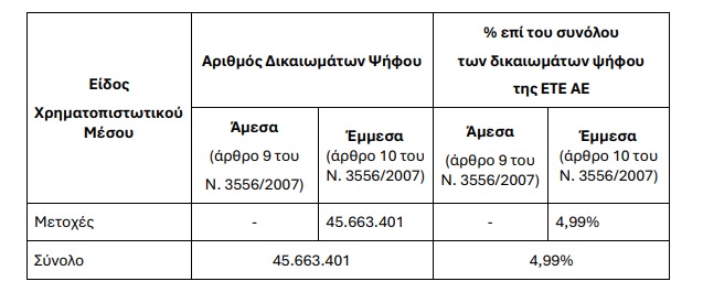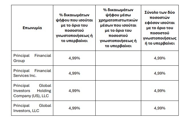 Σε συνέχεια σχετικής γνωστοποίησης σημαντικών αλλαγών στα δικαιώματα ψήφου της Τράπεζας από την “Principal Global Investors, LLC” σύμφωνα με τον Ν. 3556/2007, καθώς και της από 16.10.2025 γνωστοποίησης που έλαβε η Τράπεζα από την “Principal Financial Group”, υπό την ιδιότητά της ως τελική μητρική εταιρεία της “Principal Global Investors, LLC”, η Τράπεζα γνωστοποιεί με την παρούσα, ότι το συνολικό ποσοστό δικαιωμάτων ψήφου τα οποία αντιστοιχούν σε ισάριθμες κοινές, ονομαστικές, μετά ψήφου, άυλες μετοχές που κατέχει έμμεσα η “Principal Financial Group”, από την ημερομηνία που αυτά περιήλθαν στην κατοχή της “Principal Global Investors, LLC”, κατήλθε στις 13.10.2025 του ελάχιστου ορίου του 5% επί του συνόλου των δικαιωμάτων ψήφου της Τράπεζας.