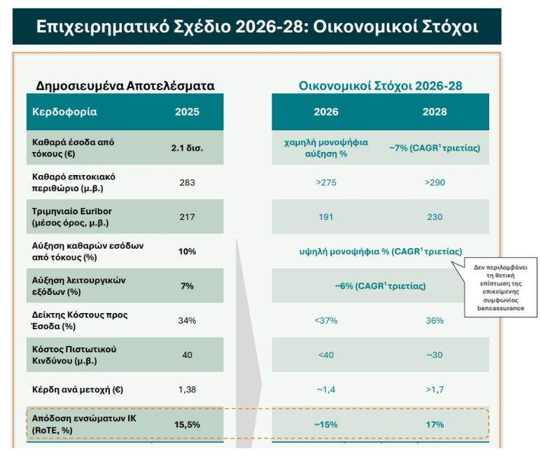 Αντλώντας οφέλη από την ισχυρή αυτή επίδοση, οι στρατηγικοί μας στόχοι, όπως αποτυπώνονται στο νέο επιχειρηματικό μας σχέδιο για την περίοδο 2026-2028, σηματοδοτούν το επόμενο στάδιο πειθαρχημένης ανάπτυξης και διαρκούς δημιουργίας αξίας. Φιλοδοξούμε να επιτύχουμε υψηλή αλλά διατηρήσιμη απόδοση ενσώματων ιδίων κεφαλαίων (RoTE), η οποία αναμένεται να ανέλθει σε 17% στο τέλος του 2028, αξιοποιώντας τις ευνοϊκές μακροοικονομικές συνθήκες προκειμένου να επιταχύνουμε την καθαρή πιστωτική επέκταση σε επίπεδα άνω των €10 δισ. εντός της επόμενης τριετίας.