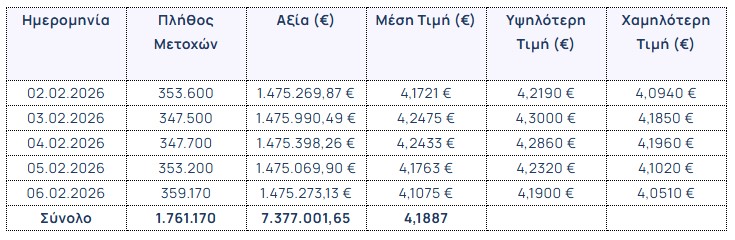 Η «Τράπεζα Eurobank Ανώνυμη Εταιρεία» (εφεξής η «Eurobank» ή η «Τράπεζα»), σε συνέχεια της από 12.12.2025 ανακοίνωσής της σχετικά με την έναρξη εφαρμογής του Προγράμματος Επαναγοράς Ιδίων Μετοχών («Πρόγραμμα»), το οποίο εγκρίθηκε με την απόφαση της Έκτακτης Γενικής Συνέλευσης των Μετόχων της Τράπεζας στις 22.10.2025, σύμφωνα με το άρθρο 49 του ν. 4548/2018, σε συνέχεια του αντίστοιχου προγράμματος της «Eurobank Ergasias Υπηρεσιών και Συμμετοχών Ανώνυμη Εταιρεία» («Eurobank Holdings») που θεσπίστηκε με την απόφαση της από 30.04.2025 Τακτικής Γενικής Συνέλευσης των Μετόχων της τελευταίας, και σε συνέχεια της από 22.10.2025 απόφασης του Διοικητικού Συμβουλίου της, ενημερώνει το κοινό ότι κατά το διάστημα 02.02.2026 – 06.02.2026 απέκτησε συνολικά, στο πλαίσιο του Προγράμματος, 1.761.170 μετοχές εκδόσεως της ιδίας («Ίδιες Μετοχές») που διαπραγματεύονται στο Χρηματιστήριο Αθηνών («Χ.Α.»), με μέση τιμή κτήσης €4,1887 ανά μετοχή και συνολικό κόστος €7.377.001,65.