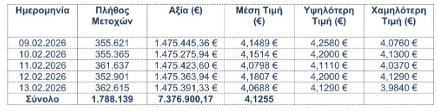 Kατά το διάστημα 09.02.2026 – 13.02.2026 η Eurobank απέκτησε συνολικά, στο πλαίσιο του Προγράμματος Επαναγοράς Ιδίων Μετοχών, 1.788.139 ίδιες μετοχές, που διαπραγματεύονται στο Χρηματιστήριο Αθηνών, με μέση τιμή κτήσης €4,1255 ανά μετοχή και συνολικό κόστος €7.376.900,17.