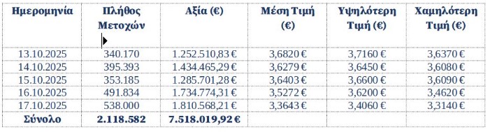 Η «Eurobank Ergasias Υπηρεσιών και Συμμετοχών Ανώνυμη Εταιρεία» («Eurobank Holdings»), σε συνέχεια της από 07.05.2025 ανακοίνωσής της σχετικά με την έναρξη εφαρμογής του Προγράμματος Επαναγοράς Ιδίων Μετοχών («Πρόγραμμα»), που εγκρίθηκε με την απόφαση της Τακτικής Γενικής Συνέλευσης των Μετόχων της Eurobank Holdings στις 30.04.2025 και σε συνέχεια της από 30.04.2025 απόφασης του Διοικητικού Συμβουλίου της, ενημερώνει το κοινό ότι κατά το διάστημα 13/10/2025 – 17/10/2025 απέκτησε συνολικά, στο πλαίσιο του Προγράμματος, 2.118.582 μετοχές εκδόσεως της ιδίας («Ίδιες Μετοχές») που διαπραγματεύονται στο Χρηματιστήριο Αθηνών («Χ.Α.»), με μέση τιμή κτήσης €3,5486, ανά μετοχή και συνολικό κόστος €7.518.019,92