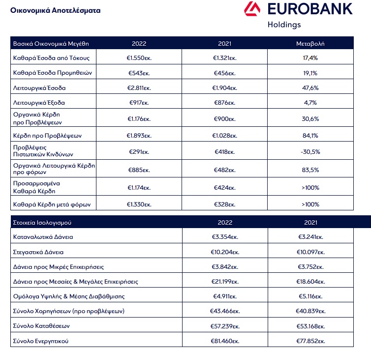 Οι επιδόσεις της Eurobank το 2022 ήταν ιδιαίτερα ισχυρές και ξεπέρασαν τις αρχικές προσδοκίες σε όρους κερδοφορίας, ποιότητας ενεργητικού και κεφαλαιακής επάρκειας. Τα οργανικά κέρδη προ προβλέψεων ανήλθαν σε €1,2δισ. το 2022, από €900εκ. το 2021, τα κέρδη ανά μετοχή αυξήθηκαν σε €0,188, από €0,119 το 2021 και η απόδοση των ενσώματων ιδίων κεφαλαίων ενισχύθηκε σε 11,4%8 το 2022, από 8,2% το 2021.