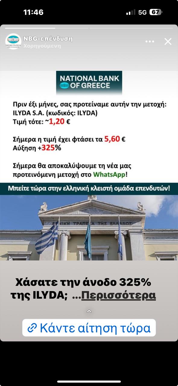 Συγκεκριμένα τις τελευταίες μέρες στο instagram εμφανίζεται με μεγάλη συχνότητα post με το λογότυπο της Εθνικής Τράπεζας, το οποίο αναφέρει: Πριν έξι μήνες σας προτείναμε αυτήν την μετοχή (εμφανίζεται όνομα μετοχής και κωδικός), και επισημαίνεται ότι η τιμή της αυξήθηκε από 1,2 ευρώ στα 5,6 ευρώ, αύξηση 325%.