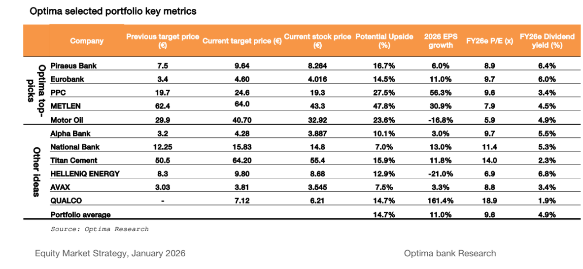 Η Optima επισημαίνει ότι το σύνολο των κορυφαίων επιλογών της για το 2026 εμφανίζει υψηλότερο ρυθμό αύξησης κερδών ανά μετοχή σε σχέση με τον μέσο όρο της αγοράς, ενώ διαπραγματεύεται με discount σε όρους αποτίμησης και προσφέρει ανώτερη μερισματική απόδοση. Σε αυτό το πλαίσιο, τα top picks για το 2026 είναι πέντε: Τράπεζα Πειραιώς, Eurobank, METLEN, ΔΕΗ και Motor Oil. Παράλληλα, στις λοιπές επενδυτικές ιδέες για τη χρονιά προτείνει τους τίτλους των Alpha Bank, Εθνική Τράπεζα, ΤΙΤΑΝ, HelleniQ Energy, ΑΒΑΞ και Qualco Group.