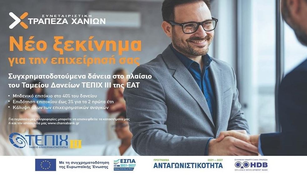 Η Συνεταιριστική Τράπεζα Χανίων συμμετέχει στο “Ταμείο Δανείων ΤΕΠΙΧ ΙΙΙ” παρέχει δάνεια με ευνοϊκούς όρους για την κάλυψη των χρηματοδοτικών αναγκών των επιχειρήσεων με έδρα την Ελλάδα, με σκοπό την ενίσχυση της παραγωγικής τους δραστηριότητας και τη βελτίωση της ανταγωνιστικότητάς τους.