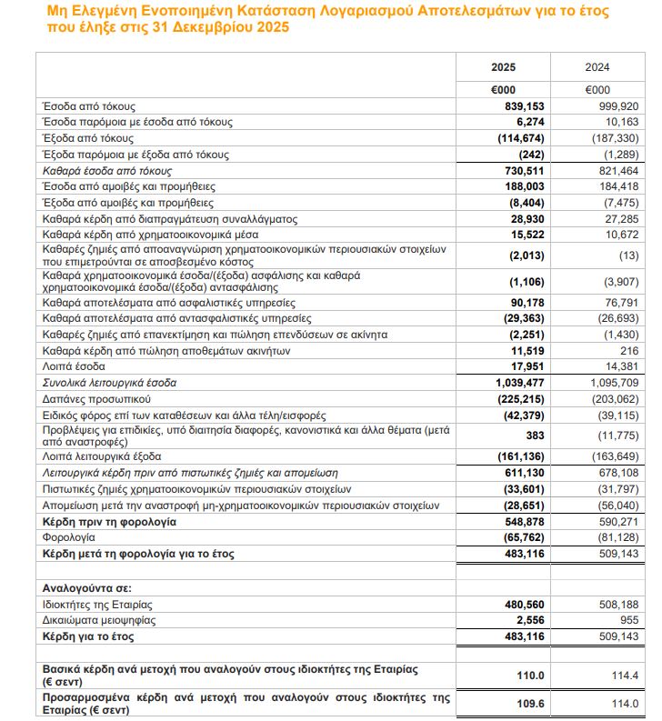Κέρδη μετά τη φορολογία ύψους €481 εκατ., εκ των οποίων €128 εκατ. το δ’ τρίμηνο 2025