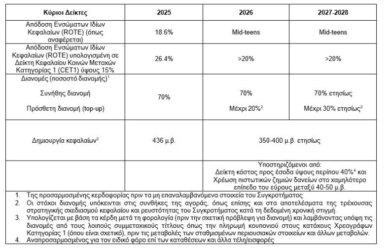 Με βάση τις εν λόγω προτεραιότητες, το Συγκρότημα έχει αναθεωρήσει τους χρηματοοικονομικούς της στόχους για την περίοδο 2026-2028 και αναμένει την επίτευξη Απόδοσης Ενσώματων Ιδίων Κεφαλαίων (ROTE) σε επίπεδα mid-teens, η οποία αντιστοιχεί σε ROTE άνω του 20% υπολογισμένη σε δείκτη CET1 ύψους 15%. Η κερδοφορία αυτή αναμένεται να υποστηρίξει οργανική δημιουργία κεφαλαίου μεταξύ 350 με 400 μ.β. ετησίως για την περίοδο 2026-2028.