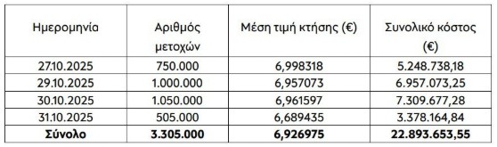 • με την από 17.10.2025 απόφαση της Έκτακτης Γενικής Συνέλευσης της θυγατρικής της, Τράπεζας Πειραιώς Α.Ε. (η «Τράπεζα») και τις από 17.10.2025 σχετικές αποφάσεις του Διοικητικού Συμβουλίου της Τράπεζας, και σε συνέχεια της ανακοίνωσης της 27.10.2025 σχετικά με την αγορά ιδίων μετοχών, ενημερώνει το κοινό ότι κατά το διάστημα 27.10.2025 – 31.10.2025 η Τράπεζα απέκτησε συνολικά, στο πλαίσιο του Προγράμματος, 3.305.000 μετοχές εκδόσεως της Εταιρείας («Ίδιες Μετοχές») που διαπραγματεύονται στο Χρηματιστήριο Αθηνών («Χ.Α.»), με μέση τιμή κτήσης € 6,926975 ανά μετοχή και συνολικό κόστος €22.893.653,55.