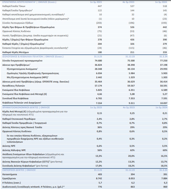 • Το 1ο τρίμηνο σηματοδοτεί ένα τρίμηνο ποιοτικής κερδοφορίας, με εξομαλυμένα κέρδη ανά μετοχή €0,21 και απόδοση ενσώματων ιδίων κεφαλαίων (RoaTBV) 16,5%, έναντι στόχων για περίπου €0,80 και 14% αντίστοιχα για το σύνολο του 2024