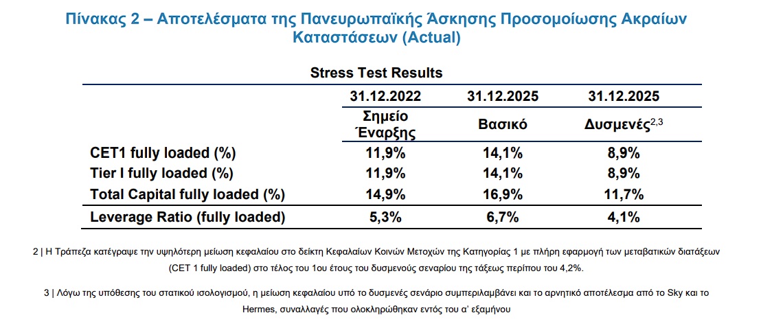 Στο δυσμενές σενάριο (χωρίς να λαμβάνονται υπόψη τυχόν γεγονότα μετά το τέλος του έτους), η μείωση του Δείκτη Κεφαλαίων Κοινών Μετοχών της Κατηγορίας 1, με πλήρη εφαρμογή των μεταβατικών διατάξεων (CET 1 fully loaded) σε χρονικό ορίζοντα τριετίας ανέρχεται σε 3,1 % για την Τράπεζα (ήταν 6,3 % στην Άσκηση Προσομοίωσης Ακραίων Καταστάσεων του 2021 ), σε σύγκριση με 4,6% του μέσου όρου της Ευρωπαϊκής Αρχής Τραπεζών (ΕΑΤ) στην Ευρωπαϊκή Ένωση (4,9 % ήταν ο μέσος όρος της ΕΑΤ στην Πανευρωπαϊκή Άσκηση Προσομοίωσης Ακραίων Καταστάσεων του 2021).