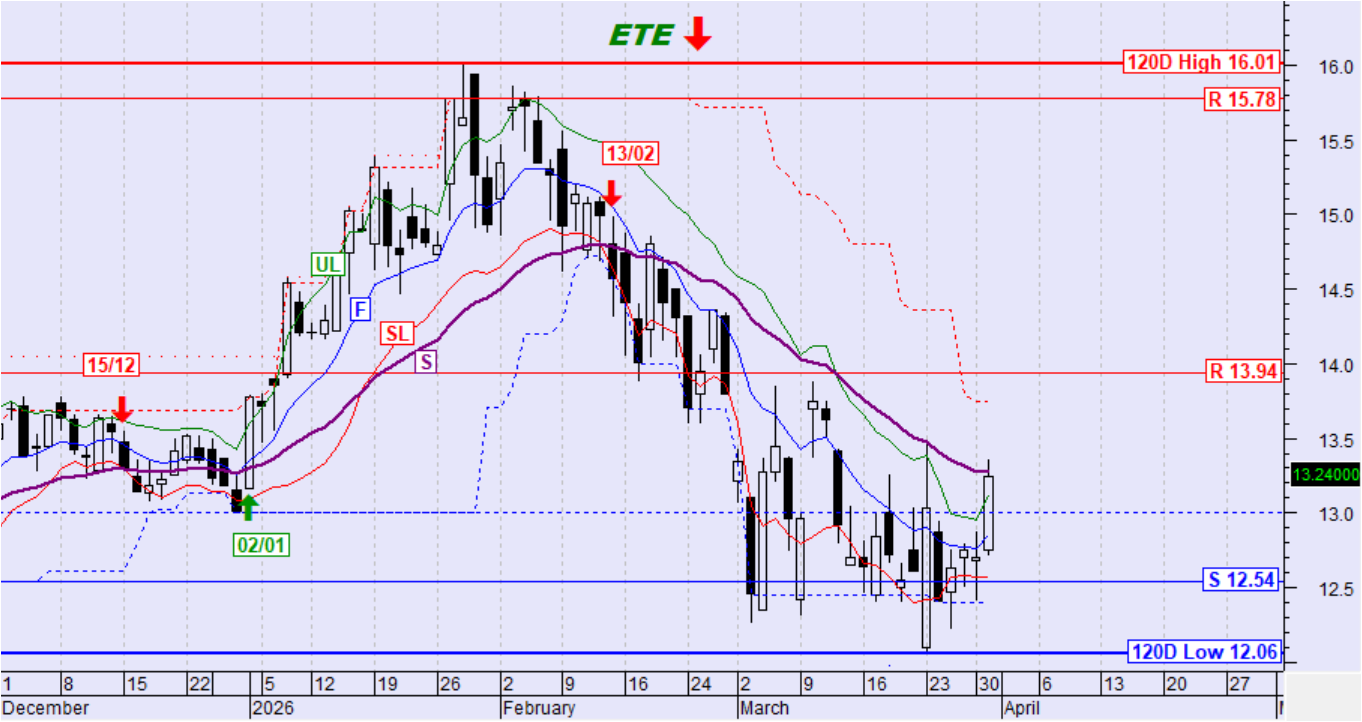 Η μετοχή κινήθηκε ανοδικά και έφτασε στον αργό κινητό μέσο όρο S διατηρώντας την στήριξη στα 12,54€. Η τεχνική εικόνα βελτιώνεται σε πρώτη φάση με υπέρβαση του αργού κινητού μέσου όρου S με στόχο την αντίσταση στα 13,94€.
