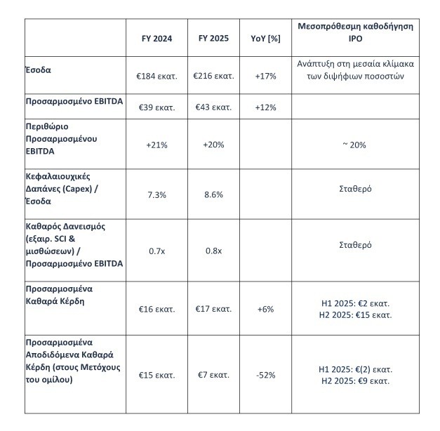 Κατά τη χρήση 2025 (FY 2025), ο όμιλος σημείωσε αύξηση εσόδων κατά 17% και αύξηση Προσαρμοσμένου EBITDA κατά 12% σε ετήσια βάση. Για τους δώδεκα μήνες που έληξαν στις 31 Δεκεμβρίου 2025, κατέγραψε περιθώριο Προσαρμοσμένου EBITDA 20%, σε ευθυγράμμιση με την καθοδήγηση της δημόσιας εγγραφής.
