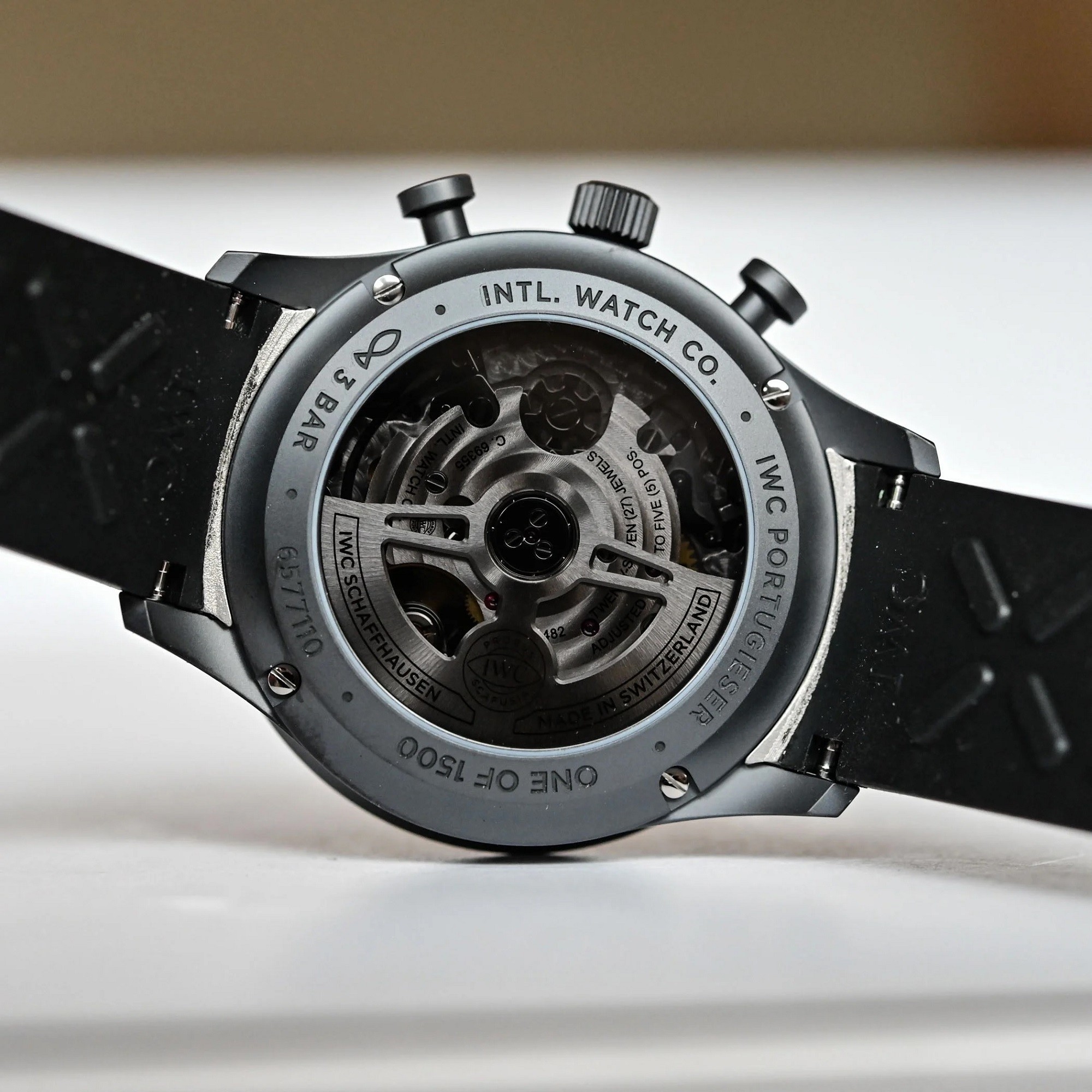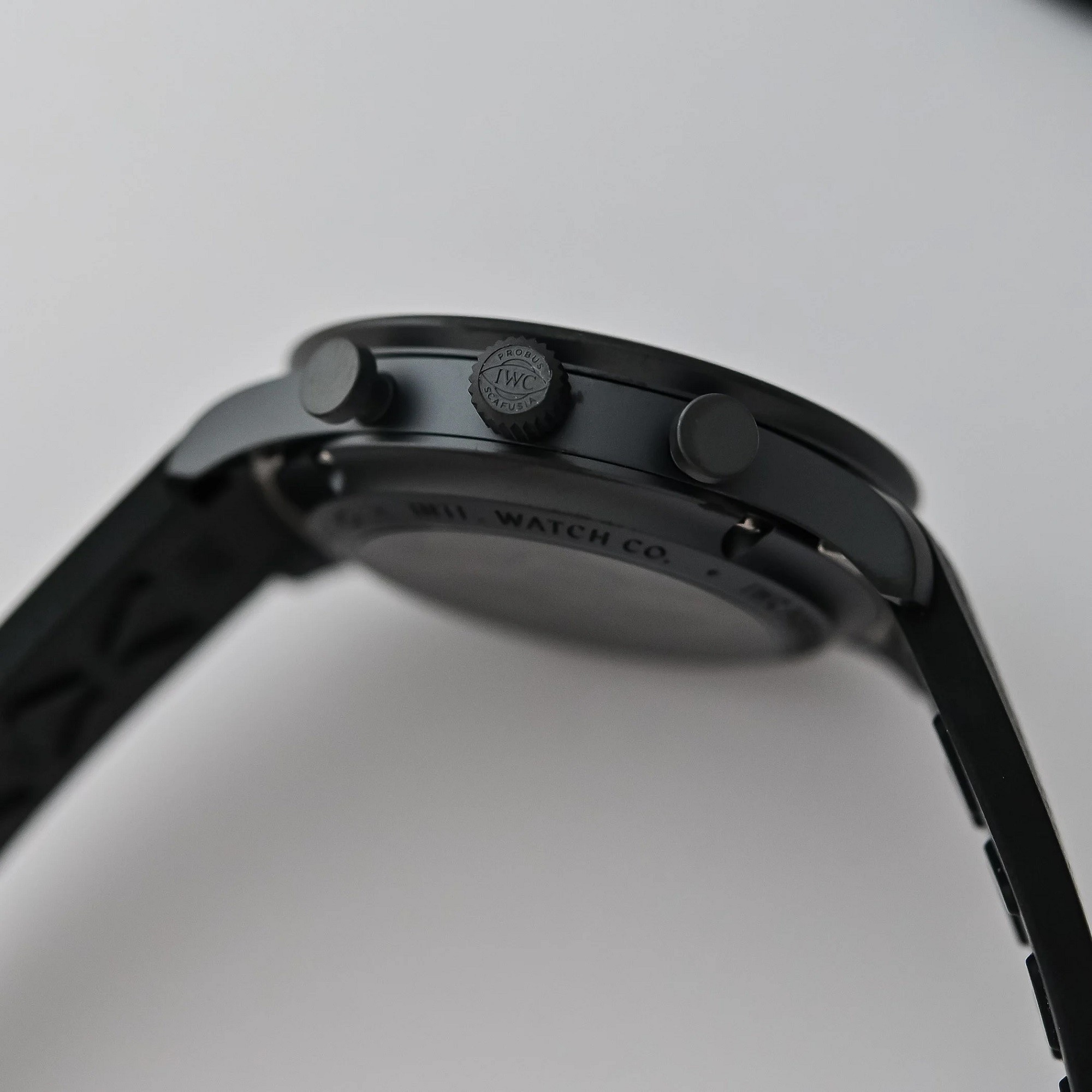 Η κάσα των 41 χιλιοστών, η κορώνα και τα κουμπιά του χρονογράφου κατασκευάζονται εξ ολοκλήρου από Ceratanium®, ένα υλικό που έχει αναπτύξει η ίδια η IWC. Πρόκειται για μια σύνθεση που ενώνει την ελαφρότητα και την ανθεκτικότητα του τιτανίου με τη σκληρότητα και την αντοχή στις γρατζουνιές που χαρακτηρίζουν το κεραμικό. Το αποτέλεσμα είναι ένα ρολόι ιδιαίτερα ελαφρύ, αλλά ταυτόχρονα εξαιρετικά ανθεκτικό, με μια χαρακτηριστική ματ, βαθιά μαύρη επιφάνεια.