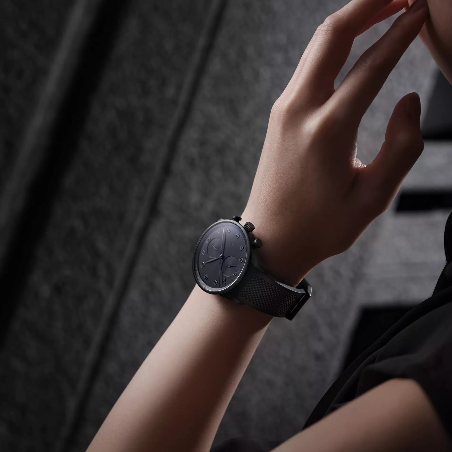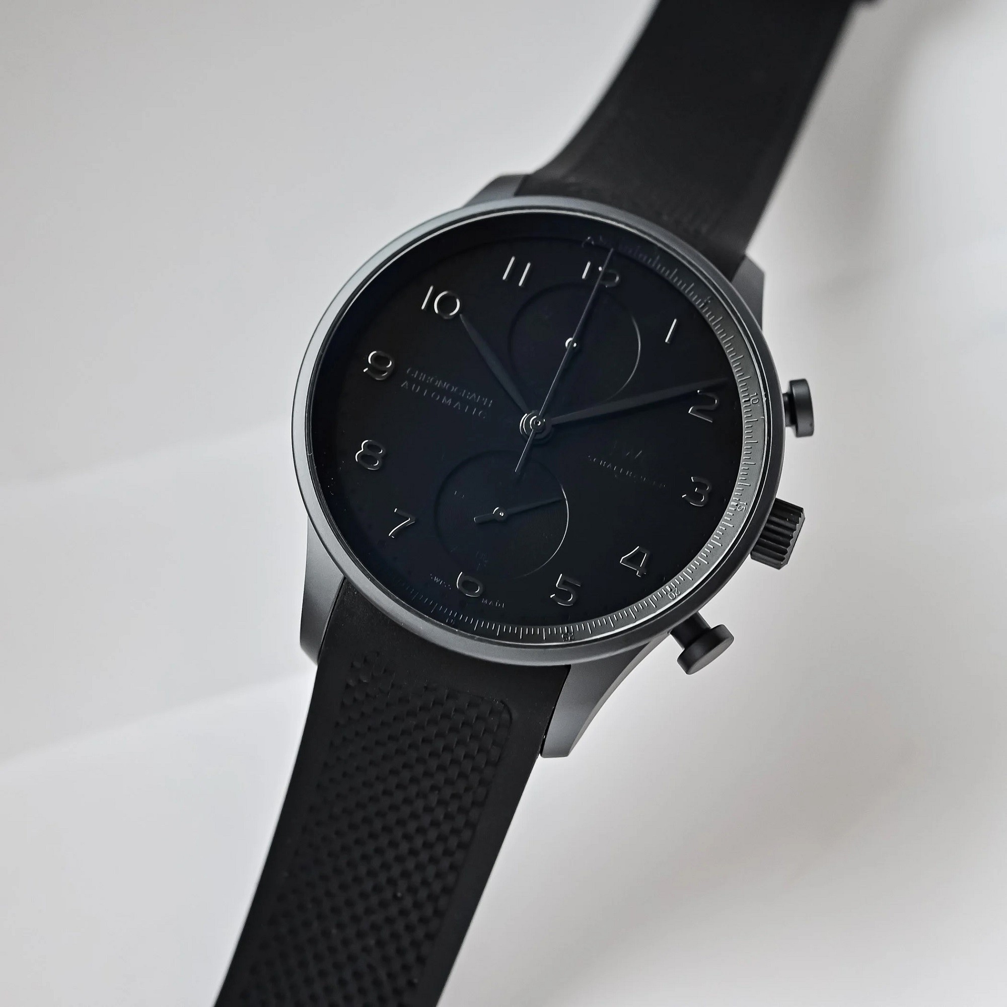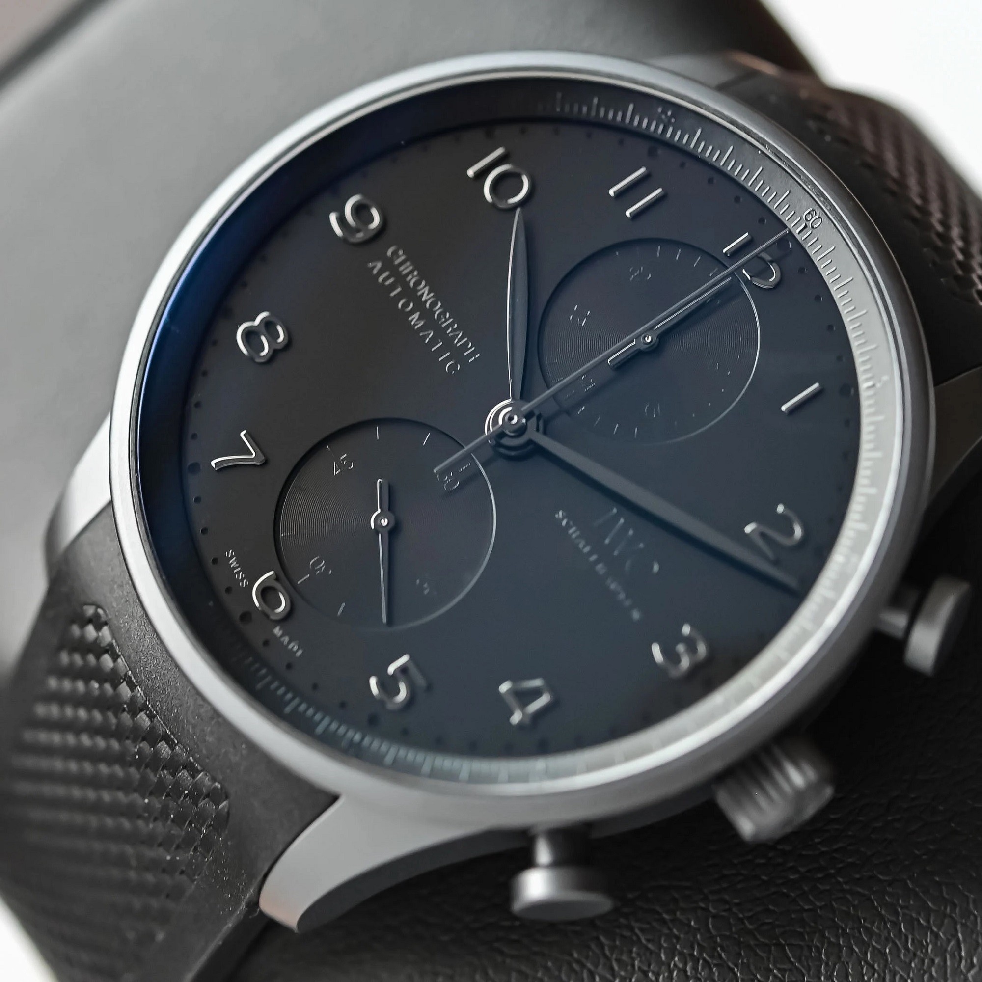 Η μονοχρωματική αισθητική συνεχίζεται και στο καντράν. Δείκτες, εφαρμοσμένοι αριθμοί και υποκαντράν ακολουθούν την ίδια σκοτεινή παλέτα, ενώ το ρολόι ολοκληρώνεται με μαύρο λουράκι από καουτσούκ. Σε αυτή την εκδοχή, το Portugieser αποκτά μια σχεδόν αρχιτεκτονική καθαρότητα, καθώς η απουσία έντονων χρωματικών αντιθέσεων αναδεικνύει τη χαρακτηριστική του σιλουέτα.