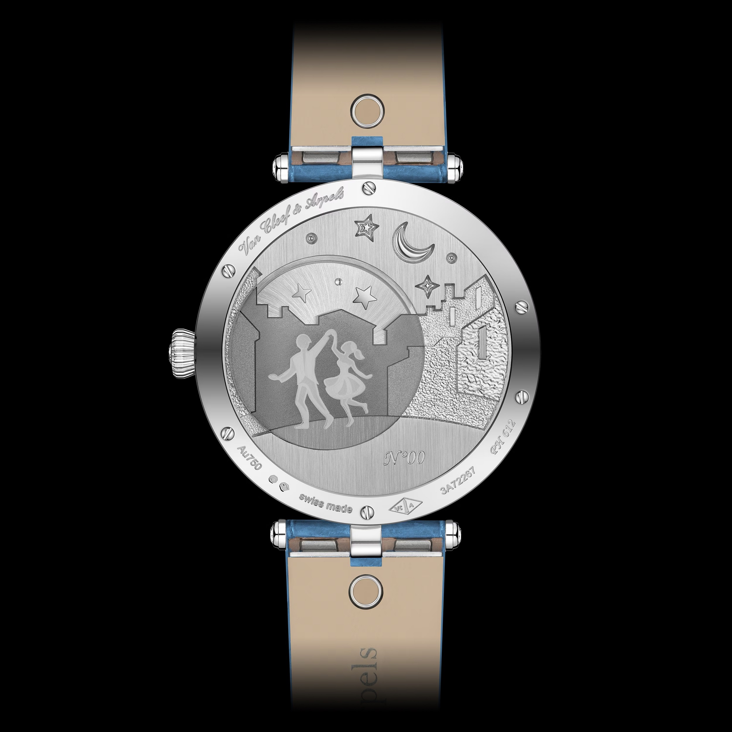 Το Lady Arpels Bal des Amoureux Automate είναι έργο τέχνης σε κάθε του λεπτομέρεια. Η κάσα του, από 18 καρατίων λευκό χρυσό με επένδυση ροδίου, έχει διάμετρο 38 χιλιοστά, ενώ το στεφάνι στολίζεται με λαμπερά διαμάντια. Το καντράν, επίσης από ροδιωμένο λευκό χρυσό, αποκαλύπτει τη μαγεία της τεχνικής grisailleσμάλτου, τόσο σε αποχρώσεις του γκρι όσο και σε έγχρωμες παραλλαγές, χαρίζοντας βάθος και ζωντάνια στη σκηνή του χορού. Οι μικροσκοπικές φιγούρες, φιλοτεχνημένες και αυτές με ροδιωμένο χρυσό, κινούνται απαλά σε συγχρονισμό, προσφέροντας μια αληθινά θεατρική εμπειρία στον καρπό.