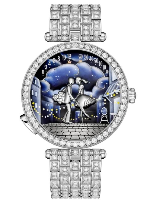 [Παρένθεση: Ο άνδρας και η γυναίκα υποδεικνύουν τις ώρες και τα λεπτά, όμως όταν ενεργοποιηθεί ο μηχανισμός, κινούνται ο ένας προς τον άλλον και φιλιούνται, ξεχνώντας για τρία λεπτά τα καθήκοντά τους ως δείκτες του χρόνου. Γιατί τρία λεπτά; Το ερώτημα τέθηκε κατά τη διάρκεια των παρουσιάσεων στην έκθεση Watches and Wonders. Ένας ειδικός της Van Cleef & Arpels απάντησε πως το να φιλιούνται οι εραστές για τρία λεπτά τούς φέρνει πιο κοντά και δημιουργεί έναν ισχυρό, βαθύ δεσμό. Αυτή είναι η ρομαντική απάντηση, όμως υπάρχει και μια πιο «επιστημονική»: έρευνες έχουν δείξει ότι το τακτικό φιλί διάρκειας τουλάχιστον τριών λεπτών μειώνει την υψηλή αρτηριακή πίεση και βελτιώνει τα επίπεδα χοληστερόλης. Βεβαίως, η επιστήμη μπορεί να εξηγήσει πολλά, όχι όμως τον έρωτα. Και εδώ τελειώνει η πεζότητα, επιστρέφουμε στο αριστούργημα.]