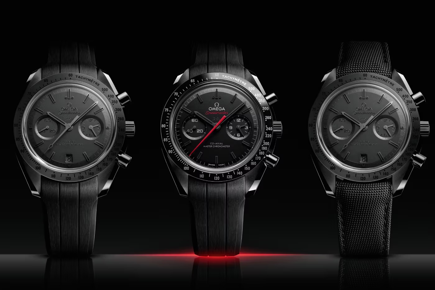 Οι επτά εκδόσεις περιλαμβάνουν τόσο νέες δημιουργίες, όσο και επανερμηνευμένα κλασικά. Ξεχωρίζουν η πιο λεπτή Black Edition με χειροκίνητο Calibre 9908, κόκκινο κεντρικό δείκτη χρονογράφου και ματ γκρι καντράν με κόκκινες λεπτομέρειες· η ανανεωμένη Dark Side of the Moon με Calibre 9900, Liquidmetal™ ταχύμετρο και κεραμικό καντράν δύο πλακών· η all-black Black Edition Calibre 9900, με σκοτεινά μηχανικά εξαρτήματα, σμάλτινο ταχύμετρο και λέιζερ-αμμοβολημένο καντράν· καθώς και η Apollo 8 Edition, που κινείται από τον Co-Axial Master Chronometer Calibre 3869 και φέρει χάραξη της σεληνιακής επιφάνειας με λέιζερ, γκρι σκελετωμένο καντράν που απεικονίζει τη «φωτεινή» πλευρά και πίσω κάσα που αποκαλύπτει τη «σκοτεινή» πλευρά του φεγγαριού.